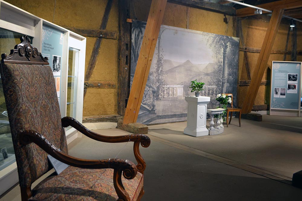 Besonderheit der Ausstellung in der Ausstellungsscheune ist die namensgebende Mitmachaktion „Posen wie früher“. Fotografen wie Otto Hofmann lichteten ihre Kundschaft vor prächtigen Kulissen ab. Eine solche ist die Hintergrundleinwand „Teck II“ vor welcher sich der junge Hermann Hesse 1899 fotografieren ließ. Museumsgäste haben ab sofort die einmalige Gelegenheit, sich vor einem Nachdruck dieser Leinwand in der Sonderausstellung in Szene zu setzen und sich zu fotografieren.