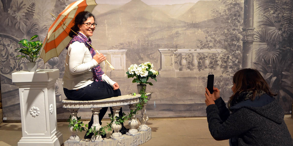 Inspiration für die Bildgestaltung, die eigene Pose, geben die ausgestellten historischen Fotografien von Otto Hofmann und zusätzlich bereitgestellte Requisiten, wie beispielsweise ein Reifen oder ein Regenschirm. Eine Besichtigung des Fotoateliers, des Originalschauplatzes, ist da fast schon ein „Muss“.
