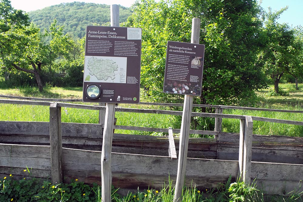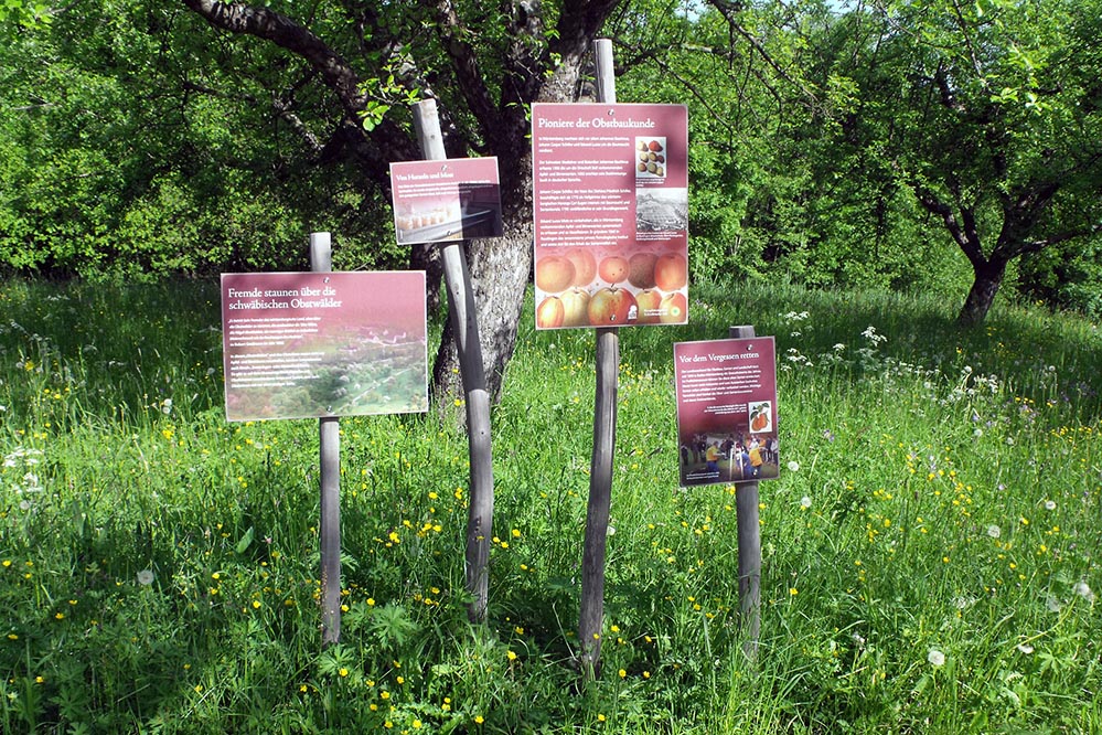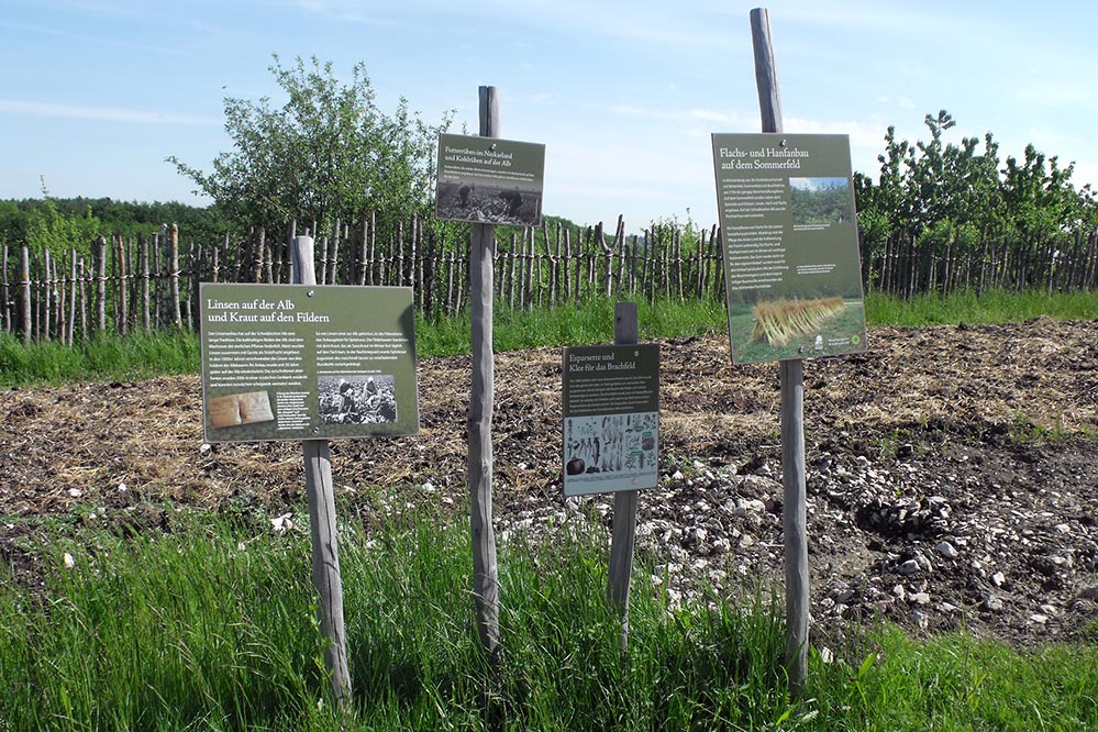 Der Themenpfad bietet unter anderem Infos zur Rolle des Wassers auf der Alb, über ausgestorbene Tiere, über die Kategorien Ungeziefer und Unkraut, zum System der Dreifelderwirtschaft, zum »Schwabenkorn«, zur Geschichte des Streuobstbaus und viel Wissenswertes zu Acker, Wiese, Weide und Wald.