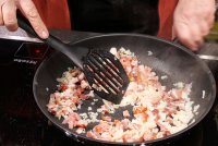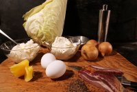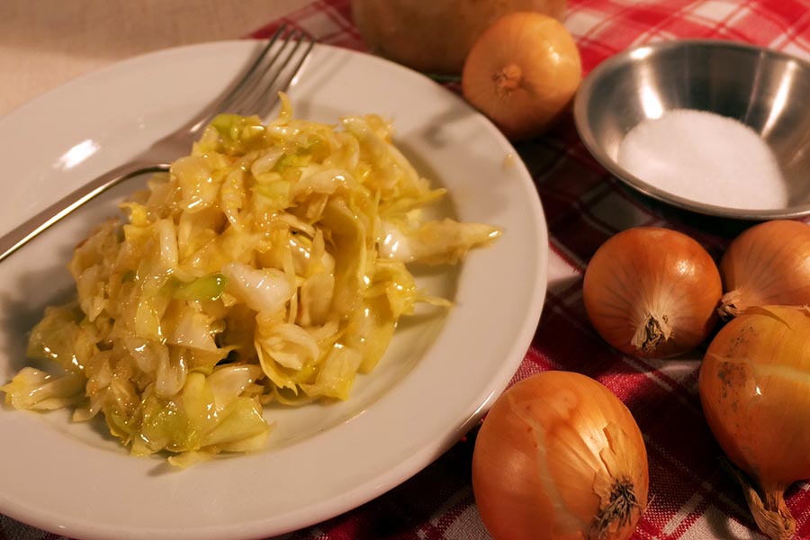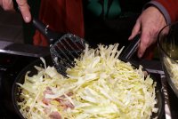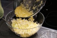 3. Im zerlassenen Butterschmalz die Zwiebeln und den Speck andünsten. Anschließend das Kraut zugeben und mit dünsten, bis es zusammenfällt. Masse vom Herd nehmen und etwas abkühlen lassen.