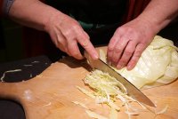 1. Das Filder-Spitzkraut halbieren, den Strunk entfernen und in feine Streifen schneiden.
