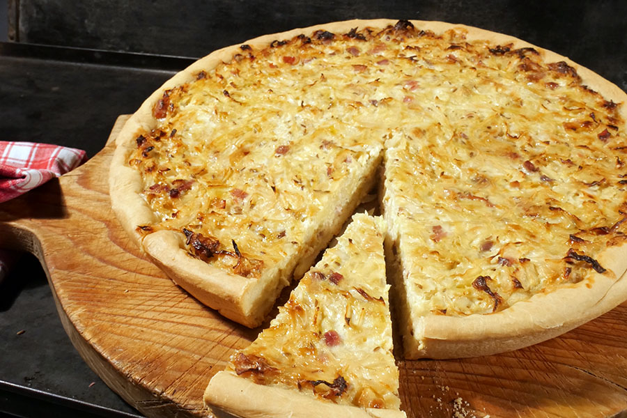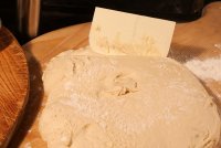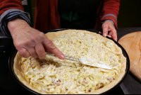 Aus den Zutaten einen Hefeteig herstellen und den Teig gehen lassen. Teig ausrollen, auf ein gefettetes Backblech mit 28 cm – 31 cm Durchmesser geben und nochmals gehen lassen. Falls Teig übrig bleiben sollte, können damit Knauzen gebacken werden.