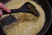 2. Die Zwiebeln klein schneiden und in reichlich gutem Olivenöl weich braten, so dass sie eine leichte Bräunung haben. Da später kein Öl mehr dazu kommt, so viel nehmen, wie normalerweise in einer Salatsoße enthalten wäre.