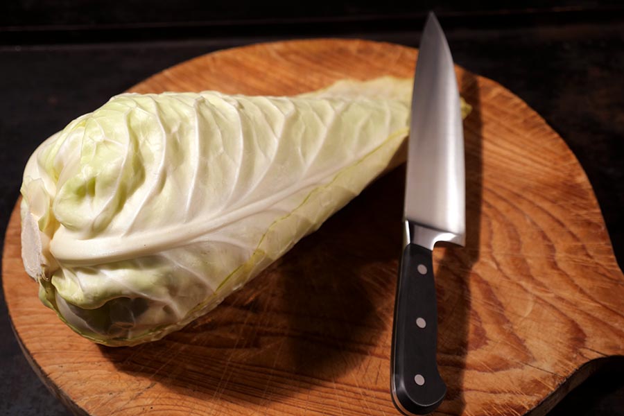 1. Den Spitzkohl von den äußeren welken Blättern befreien, vierteln und den Strunk entfernen. Das Kraut in möglichst feine Streifen schneiden. Mit einem kräftigen Schuss Essig, etwas Salz und einer Prise Zucker mischen.