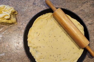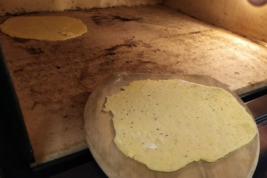 3. Mit dem Nudelholz jedes Teil in ca. 5 mm dicke Kreise auswellen und jeweils auf ein gefettetes rundes Backblech ( ⌀ 32 cm ) geben. Sollte der Teig beim Auswellen zu klebrig sein, wenig Mehl zugeben. Dies ist meist von der Kartoffelsorte abhängig. Man kann den Teig auch in kleinere Kreise auswellen und wenn möglich direkt auf dem Stein backen.