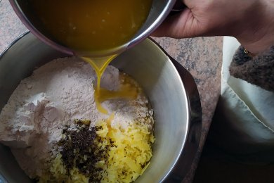 2. Restliche Zutaten zugeben und zügig zu einem gleichmäßigen Teig kneten. Den Teig in 4 Teile teilen und kurz ruhen lassen.