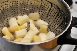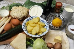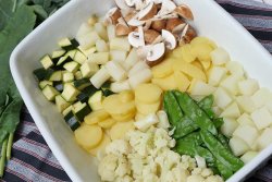 etwa 1 kg Mischung Kartoffeln z.B. Sieglinde und Gemüse wie z.B. Blumenkohl, Broccoli, Zucchini, Spargel, Mangold, Erbsen, Champignons, …
