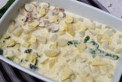5. Diesen Guss über dem Gemüse verteilen, mit dem Parmesan bestreuen und mit Butterflöckchen belegen.