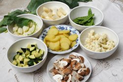 1. Kartoffeln kochen und anschließend in Scheiben schneiden. Restliches Gemüse waschen, in mundgerechte Stücke kleinschneiden und kurz blanchieren. Champignons roh in Stücke schneiden.