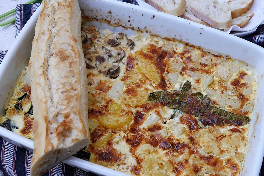 2. Eine flache feuerfeste Form dick mit Butter einstreichen. Das vorbereitete Gemüse und die Kartoffeln darin verteilen