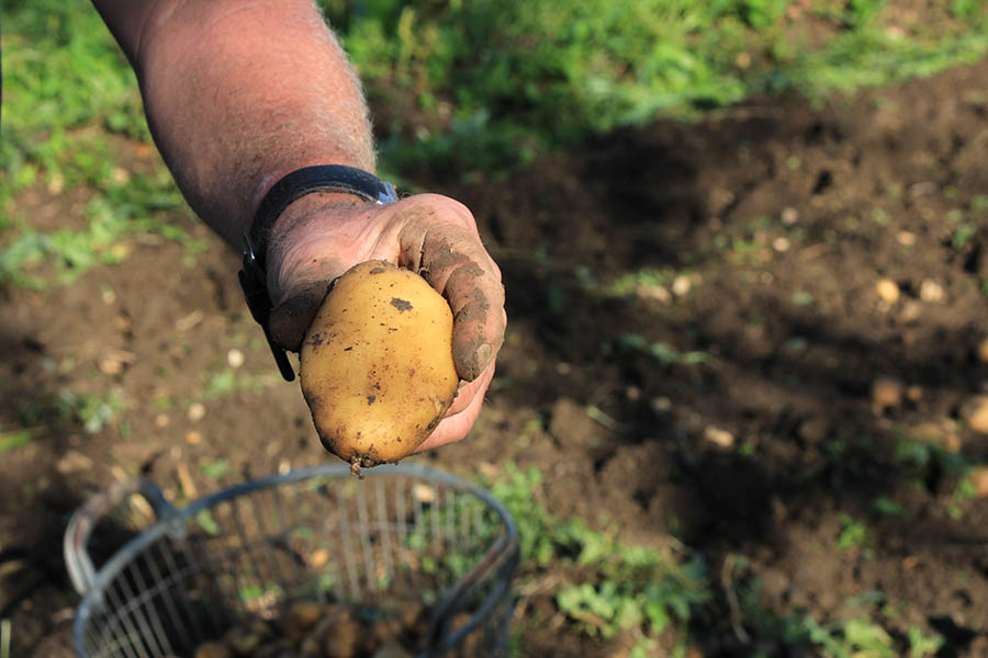 Pflanzung der Knollen im April. Etwa 2-3 Wochen nachdem das Kraut abgestorben ist und die Tochterknollen sich von der Mutterknolle lösen, können Kartoffeln geerntet werden. Frühe Sorten sind ab Juli / August und späte Sorten im September / Oktober erntereif.
