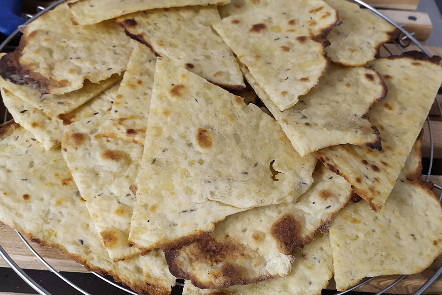 6. Die fertigen Kuchen mit zerlassener Butter bestreichen und mit ein wenig Salz bestreuen, nach Belieben auch mit Kümmel bestreuen. Teig noch warm in Stücke schneiden
