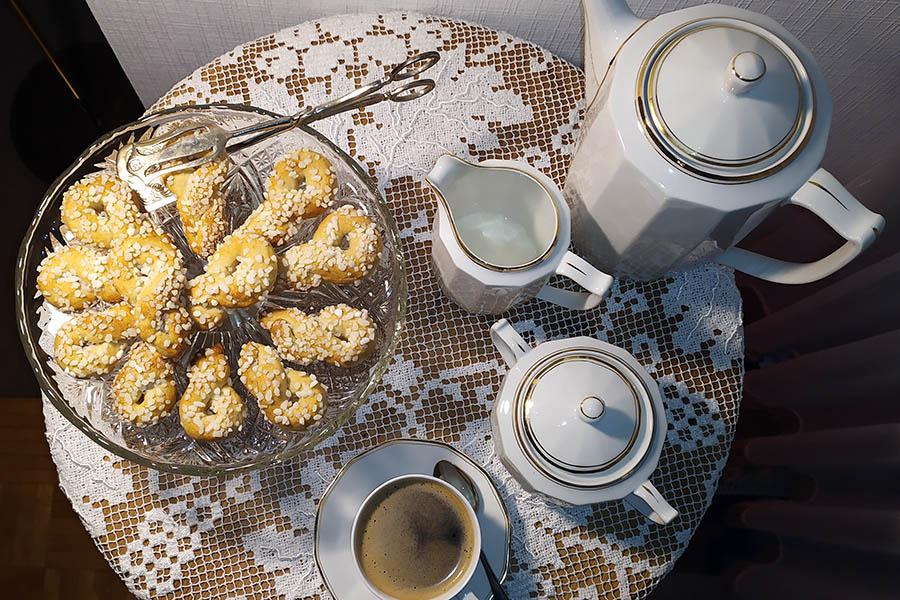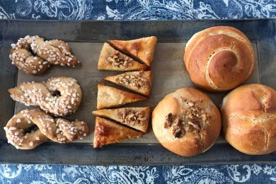 4. Gebäckstücke mit Wasser oder Milch bestreichen, einschneiden oder mit dem Brötchendrücker bearbeiten. Nach Belieben mit Saaten oder Körnern bestreuen.