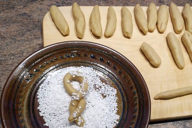 2. Die Teigmenge in ca. 24 Stücke teilen und auf Hagelzucker zu Strängen (ca. 20 cm) ausrollen.