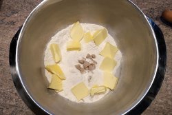 1. Aus den Zutaten einen Hefemürbteig zubereiten.