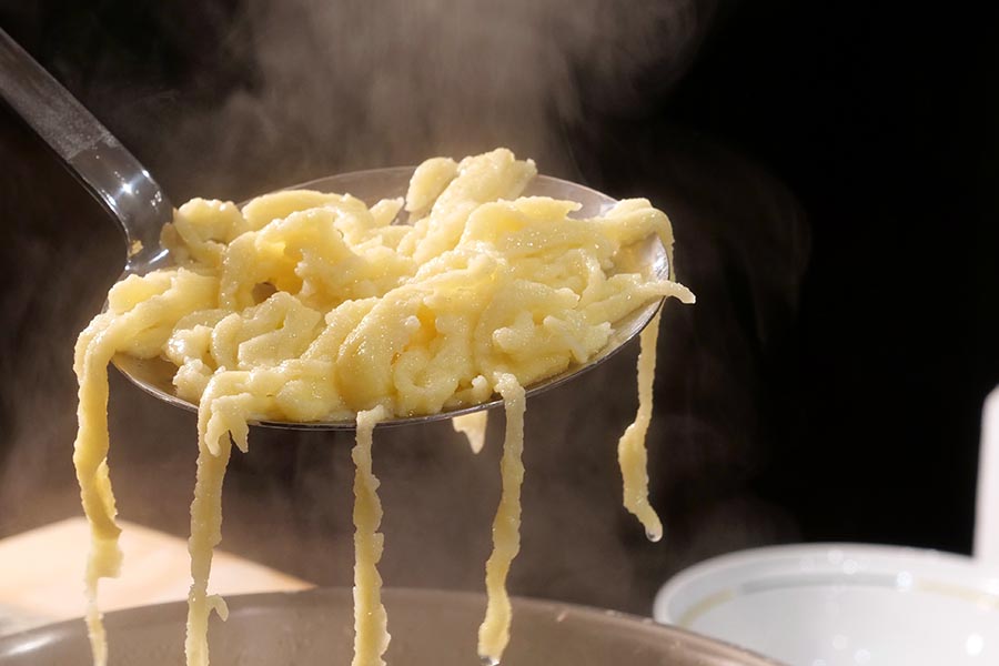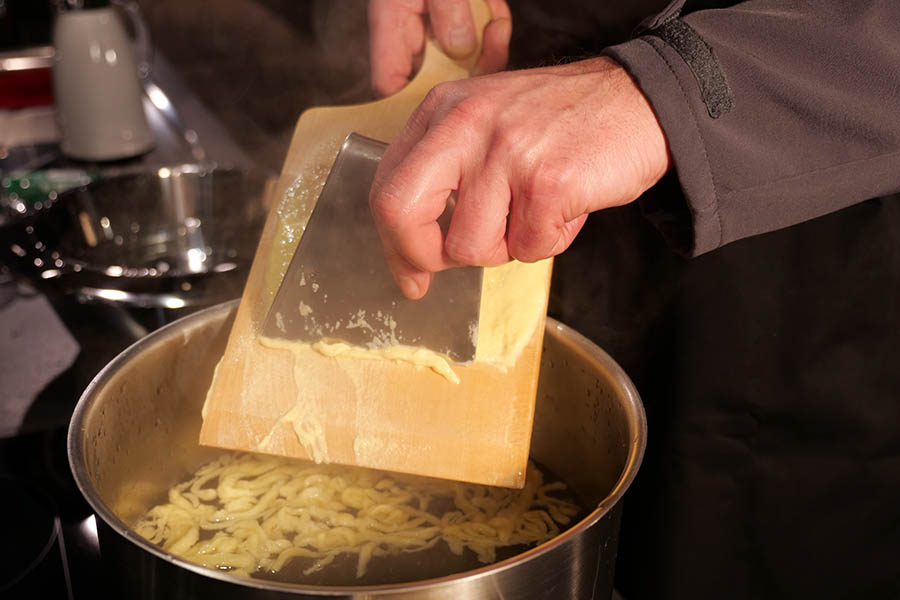 3. Einen großen Topf mit Salzwasser aufkochen lassen. Den Spätzleteig mit einem befeuchteten Schaber oder einem flachen Messer auf ein befeuchtetes Brettchen streichen. Möglichst dünne Teigstreifen vom Brett direkt ins kochende Wasser schaben. Wahlweise kann auch eine Spätzlepresse verwendet werden. Die Spätzle im Wasser aufsteigen lassen, 2 Minuten kochen. Mit einer Schaumkelle herausschöpfen, abtropfen lassen, in Wasser kurz abschwenken und warmstellen.