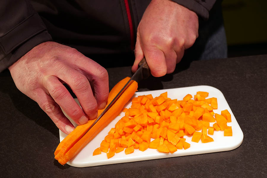 1. Zwiebeln fein würfeln und in etwas Öl braun anbraten. Karotten in kleine Würfel schneiden und zu den Zwiebeln geben, anschließend Tomatenmark zugeben und leicht rösten.