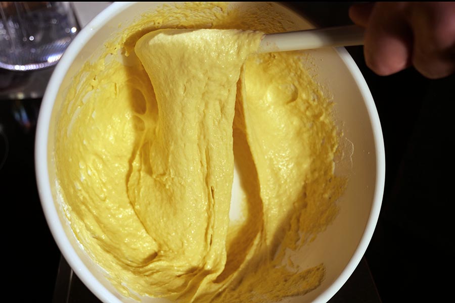 2. Während die Linsen kochen: Eier, Wasser, ein TL Salz und Spätzlemehl zu einem zähflüssigen Teig verrühren. Den Teig in der Schüssel so lange schlagen, bis er Blasen wirft.