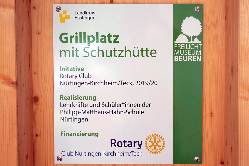 Das Freilichtmuseum Beuren, Museum des Landkreises Esslingen für ländliche Kultur, ist um eine Attraktion für Familien und Gruppen reicher. Auf Initiative des Rotary Clubs Nürtingen-Kichheim/Teck und Dank dessen finanzieller Unterstützung konnte ein Grillplatz mit zwei Grillstellen sowie einer Schutzhütte gebaut werden. Die Realisierung erfolgte durch Lehrkräfte, Schülerinnen und Schüler der Philipp-Matthäus-Hahn-Schule Nürtingen. Der Grillplatz ist seit Juli 2020 in Betrieb und kann von Gruppen, Familien und Einzelbesucherinnen und Einzelbesuchern genutzt werden.