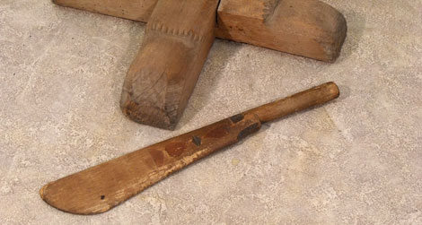 Schwert und Schwingstock aus der Sammlung des Freilichtmuseums sind aus stabilem Buchenholz, der Fuß des Schwingstocks ist aus Eiche. Eine schwarz-rote Verzierung des Schwertes und Einkerbungen am Schwingstock lassen vermuten, dass es sich bei der Flachsschwinge wahrscheinlich um eine Gabe für die Aussteuer handelt.