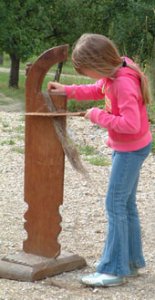 Neugierig geworden? Kinder und Jugendliche haben die Möglichkeit, sich im Freilichtmuseum Beuren einmal selbst an der Flachsschwinge zu versuchen. Bei der Aktion „Vom Flachs zum Leinen“ können Schulklassen die Flachsaufbereitung Schritt für Schritt „learning by doing“ nachvollziehen.
