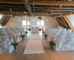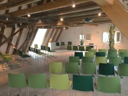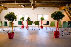 Mit Sichtfachwerk bis in die Dachspitze bietet dieser Saal das besondere Ambiente für bis zu 66 Hochzeitsgäste. Stimmungsvolle Beleuchtung sorgt für eine Wohlfühlatmosphäre, an eine Trauung hier erinnern Sie sich gerne zurück. Abgerundet wird dies durch moderne Veranstaltungstechnik.