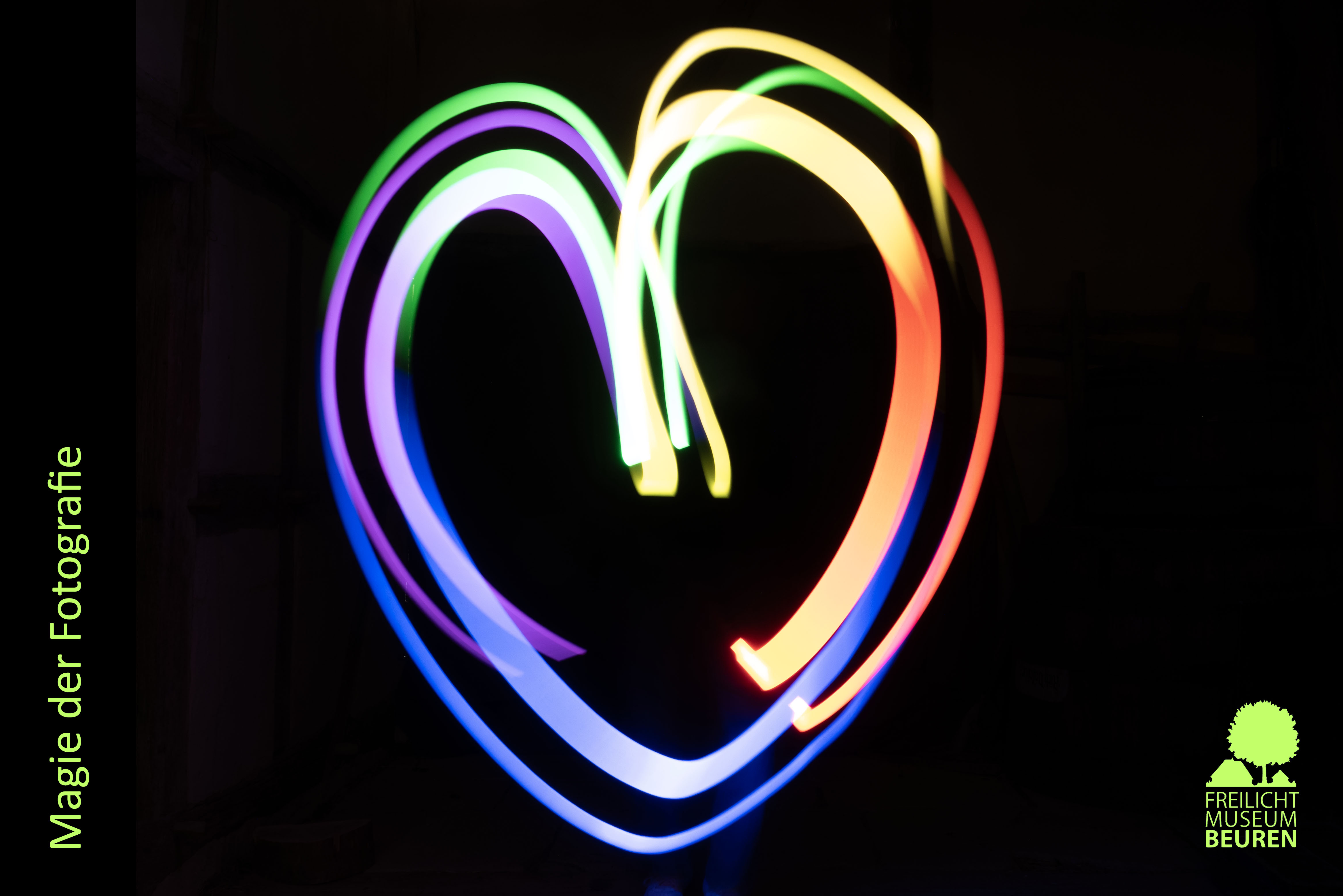 In der dunklen Scheune „zeichnen“ wir mit Leuchtstäben oder Taschenlampen Herzen, Kreise oder was euch sonst noch einfällt. Wie das genau funktioniert, zeigt ihnen die Bildgestalterin aus Gärtringen. Ihre Kunstwerke könnt Sie anschließend mit nach Hause nehmen.